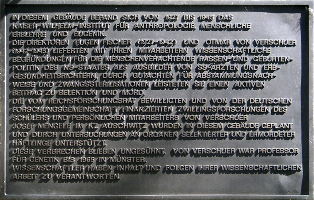 Gedenktafel zur Erinnerung an das Kaiser-Wilhelm-Institut für Anthropologie, menschliche Erblehre und Eugenik und dessen Funktion und Bedeutung im Nationalsozialismus.